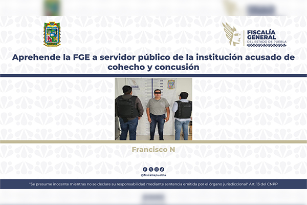 Por su probable responsabilidad en la comisión de los delitos de cohecho y concusión, la Fiscalía General del Estado dio cumplimiento a la orden de aprehensión en contra de Francisco N., quien se desempeñaba como agente del Ministerio Público de la Fiscalía Especializada en Investigación de los Delitos de Desaparición Forzada de Personas y Desaparición Cometida por Particulares.