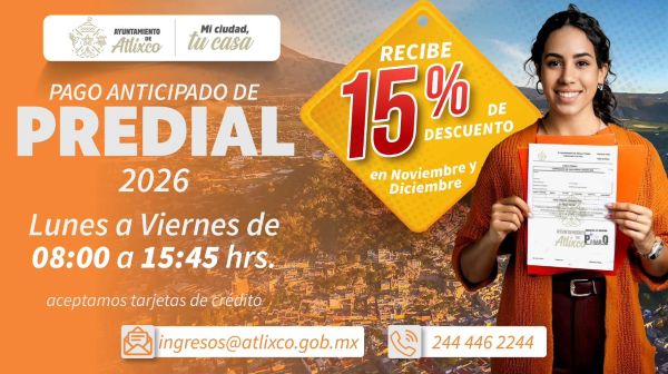El Ayuntamiento de Atlixco, encabezado por la presidenta Ariadna Ayala, informó que durante noviembre y diciembre las y los contribuyentes podrán obtener un 15% de descuento al realizar el pago anticipado del Predial 2026, como parte de los estímulos fiscales que promueven el cumplimiento y apoyan la economía familiar.