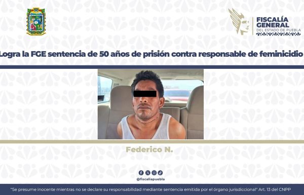 La Fiscalía General del Estado, obtuvo una sentencia condenatoria de 50 años de prisión en contra de Federico N., de 53 años de edad, tras acreditar de manera plena su responsabilidad penal en la comisión del delito de feminicidio, cometido en el municipio de Zacatlán.
