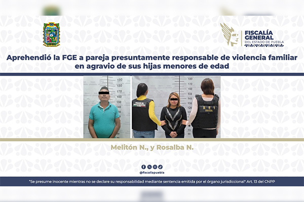 La Fiscalía General del Estado de Puebla cumplió con la aprehensión de Melitón N., y Rosalba N., por su probable responsabilidad en el delito de violencia familiar, en agravio de sus hijas de ocho y cuatro años de edad.