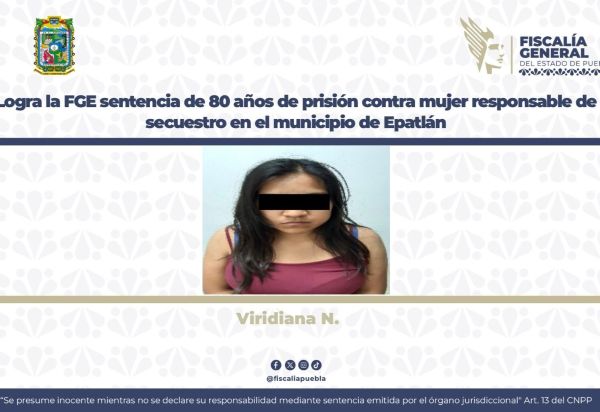 La Fiscalía General del Estado de Puebla logró una sentencia de 80 años de prisión contra Viridiana N., al demostrarse su responsabilidad penal en el delito de secuestro agravado cometido en el municipio de Epatlán, Puebla.