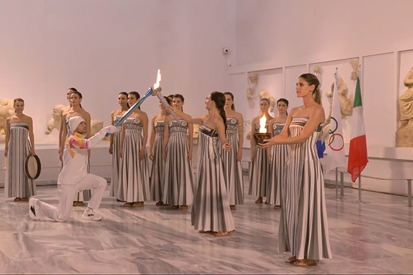 Tras la representación teatral, la "suma sacerdotisa" entregó la llama al primer portador del Relevo de la Antorcha Olímpica, el medallista de bronce Petros Gkaidatzis, campeón de remo de París. Posteriormente, se le unió la esquiadora italiana y cuatro veces campeona mundial Stefania Belmondo.