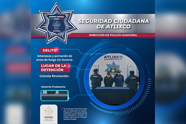 Elementos de la Secretaría de Seguridad Ciudadana de Atlixco detuvieron a dos personas del sexo masculino en la colonia Revolución, señaladas por presuntas amenazas con arma de fuego.