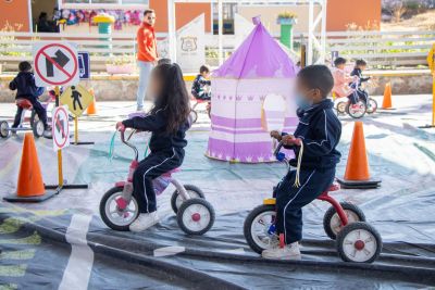 Posteriormente, las y los participantes realizaron un recorrido por un circuito vial a escala que simula calles y cruces urbanos, donde mediante el uso de bicicletas, triciclos y desplazamientos a pie, adquirieron conocimientos sobre señalización y conductas seguras en la vía pública.