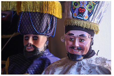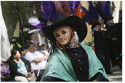 La máscara o careta, generalmente tallada en madera, representa rostros europeos con rasgos exagerados como ojos claros, bigotes pronunciados y piel blanca, esta representación tiene un sentido satírico, pues simboliza la imitación y burla hacia los antiguos colonizadores españoles.