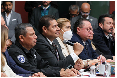 Refrendó su respaldo a la Estrategia Nacional de Seguridad encabezada por la presidenta de México, Claudia Sheinbaum, y el trabajo conjunto con la Secretaría de la Defensa Nacional (DEFENSA), Secretaría de Marina (SEMAR), la Guardia Nacional y el Gabinete de Seguridad. Reafirmó que en México no existe impunidad y se combate a los grupos delictivos, pues la tranquilidad de la población es una prioridad.