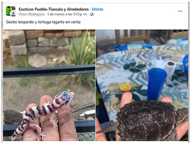 Pero el comercio ha migrado de forma masiva al entorno digital, grupos públicos y privados en Facebook como “Exóticos Puebla-Tlaxcala y Alrededores”, “Reptiles, Mascotas, Exóticos Puebla”, "Reptiles Puebla" o “Tortugueros Puebla” concentran ofertas de crías y ejemplares juveniles con descripciones como recién nacidos o mansos.