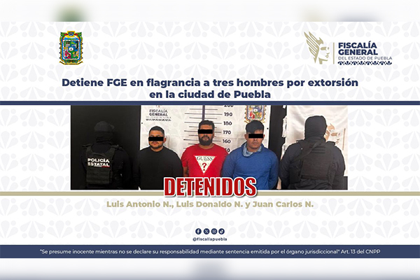 Como resultado de la intervención inmediata de elementos de seguridad estatal, la Fiscalía General del Estado de Puebla (FGE) detuvo en flagrancia a Luis Antonio N., Luis Donaldo N. y Juan Carlos N., por su probable responsabilidad en el delito de extorsión, en agravio de un comerciante.