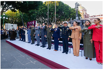 El Gobierno del Estado de Puebla reafirma su compromiso de trabajar con legalidad, coordinación y visión de futuro para consolidar una entidad más justa, segura y próspera, honra su historia y genera bienestar para las y los poblanos. Como parte de la ceremonia conmemorativa, se realizó el pase de revista a elementos de la Secretaría de la Defensa Nacional (DEFENSA), Guardia Nacional (GN), policía estatal, policía municipal y Protección Civil, en reconocimiento a su labor permanente en favor de la seguridad y la paz social.