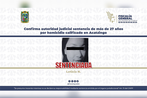 Como resultado del seguimiento jurídico, la Fiscalía General del Estado de Puebla (FGE) obtuvo la confirmación de sentencia condenatoria en contra de Leticia N., por su responsabilidad en el delito de homicidio calificado, hecho acontecido en el municipio de Acatzingo.