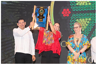 Acompañada por la gobernadora de Guerrero, Evelyn Salgado Pineda, la titular de la Secretaría de Turismo del Gobierno de México, hizo la entrega representativa al gobernador de Puebla Alejandro Armenta Mier. "La siguiente edición nos espera en el bello estado de Puebla, sean todos bienvenidos", afirmó Josefina Rodríguez.