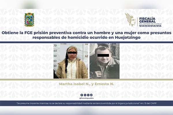 La Fiscalía General del Estado de Puebla logró mediante la aportación de datos de prueba, prisión preventiva contra Martha Isabel N. y Ernesto N., por su probable participación en el...