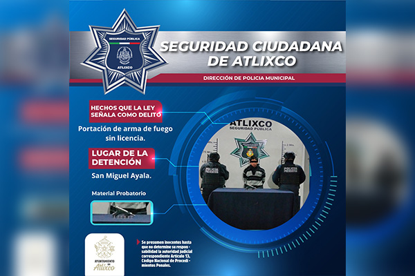 Durante un operativo en San Miguel Ayala en Atlixco, policías municipales y estatales detuvieron en la madrugada a un joven que consumía bebidas alcohólicas en la vía pública y portaba un arma de fuego sin licencia.
