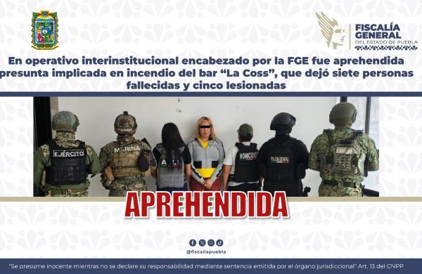 Lo anterior, como resultado de actos de investigación realizados a través de los cuales se obtuvieron diversos datos de prueba para identificar a Isabel N., como presunta partícipe en los hechos ocurridos el pasado 18 de noviembre, en el bar “La Coss”, ubicado en la colonia Popular Coatepec, de la ciudad de Puebla, donde fue provocado un incendio que derivó en la muerte de siete personas y cinco más resultaron lesionadas.