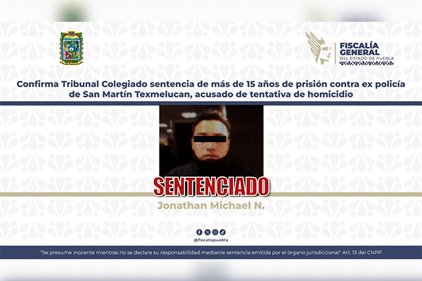 La Fiscalía General del Estado de Puebla informa que el Tribunal Colegiado confirmó la sentencia de 15 años 10 meses de prisión, dictada en contra de Jonathan Michel N., acusado de homicidio calificado en grado de tentativa en el municipio de San Martín Texmelucan, Puebla.