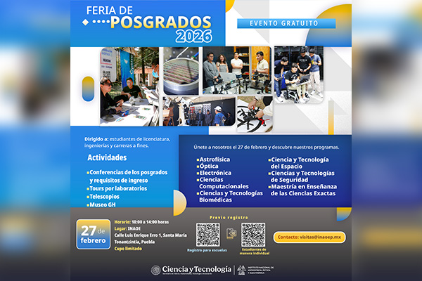 La Feria de Posgrados del INAOE está dirigida a estudiantes de las carreras de Físico-Matemáticas, Ingenierías y áreas afines. El evento se llevará a cabo el 27 de febrero de 10 a 14 horas en el Instituto, ubicado en Santa María Tonantzintla, Puebla.
