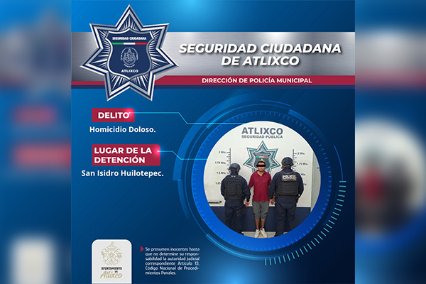 La Secretaría de Seguridad Ciudadana de Atlixco informó la detención de un masculino por su probable participación en el delito de homicidio doloso, registrado en la localidad de San Isidro Huilotepec.